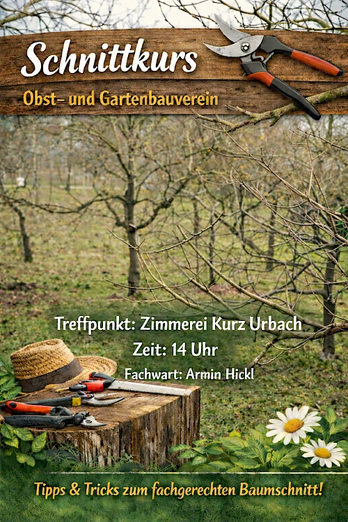 29.12.25 14:00 bis 29.12.25 17:00 Am Montag, dem 29.12.2025, findet unser traditioneller Obstbaumschnitt zwischen den Jahren statt. Der Kurs wird von Fachwart für Obst- und Garten- und Obstbaumpflege, Armin Hickl, durchgeführt. Treffpunkt Zimmerei Kurz um 14 Uhr. Dieses Jahr werden ältere Bäume geschnitten.
