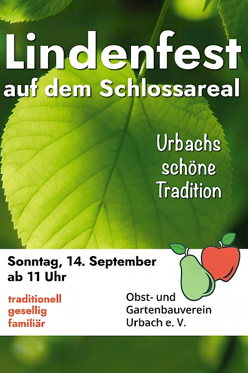 Der Obst- und Gartenbauverein Urbach lädt auch in diesem Jahr herzlich zum traditionellen Lindenfest auf dem idyllischen Schlossareal ein. Am Sonntag den 14. September ab 11 Uhr erwartet die Besucherinnen und Besucher ein buntes Programm für Jung und Alt.